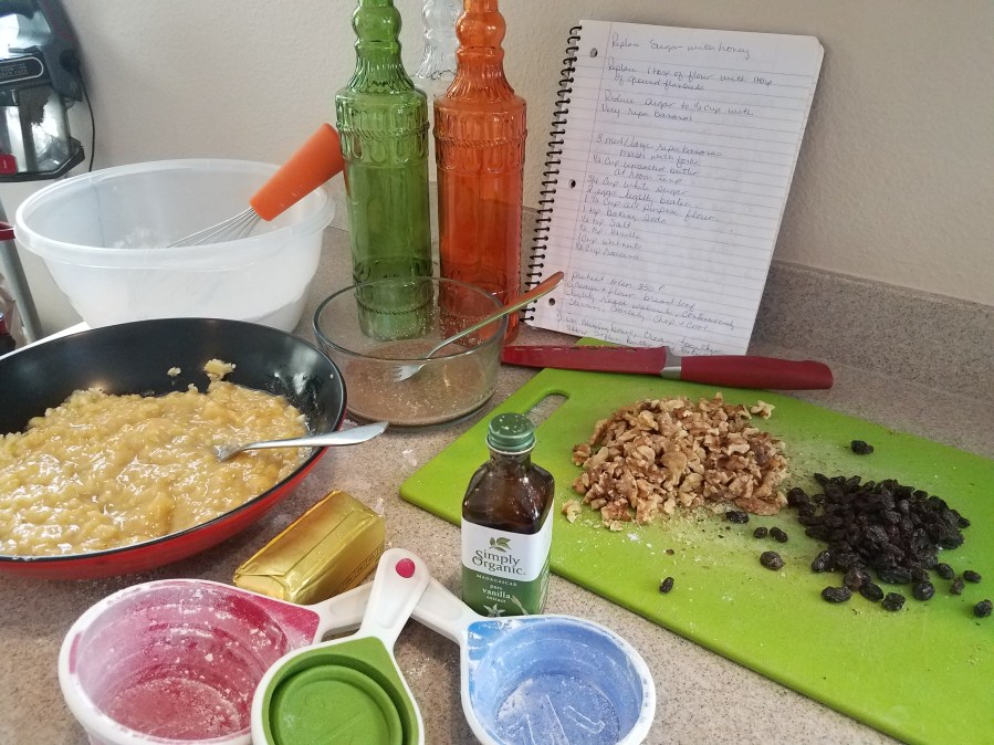 You may be wondering why our banana bread is round? Well it is quite simple…We don’t have a loaf pan. The recipe calls for the bread to bake for 50 to 60 minutes in a loaf pan. We cook our bread for 30 to 35 minutes in a spring load pan.